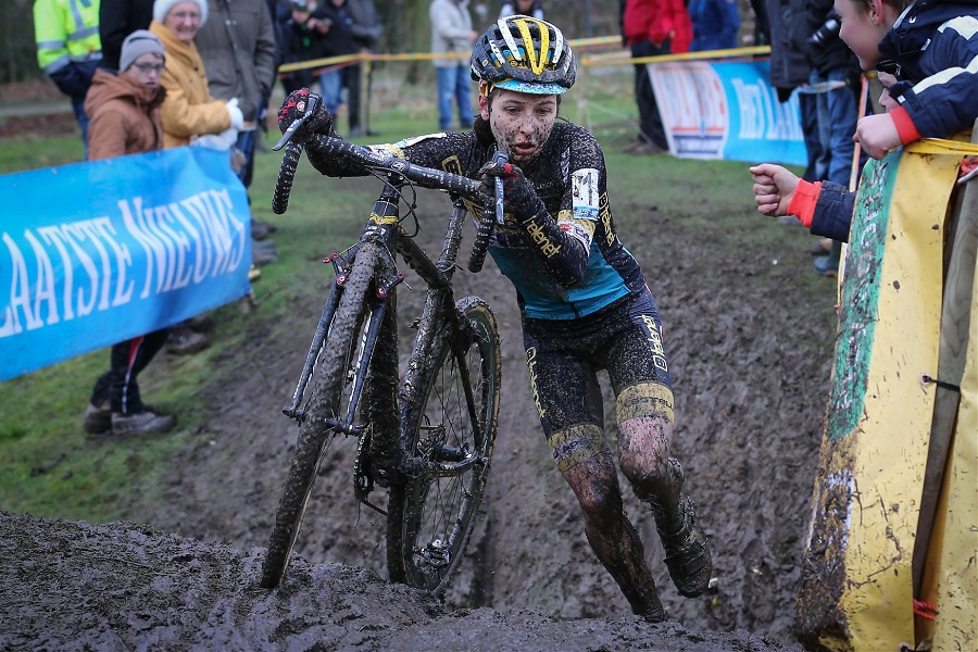 Flink wat modder in de Kasteelcross van Zonnebeke. Jolien Verschueren haalde het voor teamgenote Loes Sels en Maud Kaptheijns Foto's©Photopress.be